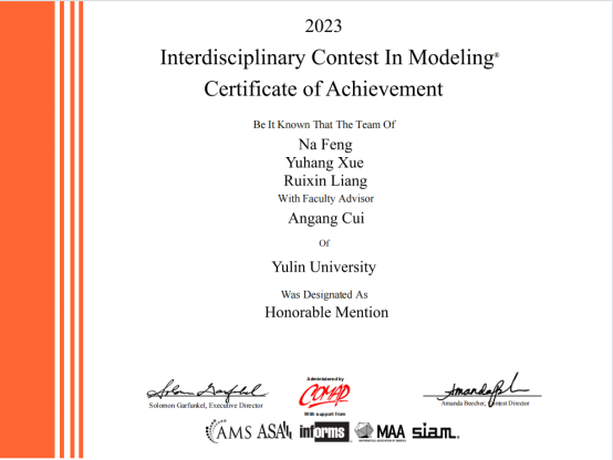 近日,2023年美国老员工数学建模竞赛(MCM/ICM)成绩揭晓,公司选拔的3支参赛队全部获奖。其中,由崔安刚指导的参赛队获得二等奖(H奖),团队成员包括冯娜、薛钰航、梁瑞欣三名同学。另外两支参赛队由杨宏、万鹏飞指导,均获三等奖(S奖),两支参赛团队成员分别为马乾、刘昊杰、阚勤琴三名同学,周智华、井霄飞、史江涛三名同学。