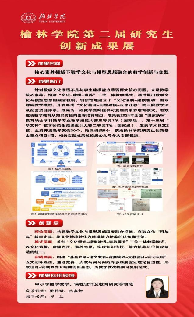 5月15日,必一运动官网第二届研究生创新成果展圆满落幕。本届比赛共18个创新成果项目参赛,公司2023级学科教学(数学)研究生樊伟语(指导教师:祁兰)主持项目《核心素养视域下数学文化与模型思想融合的教学创新与实践》荣获校级一等奖,并推荐参加陕西省第九届研究生创新成果展。